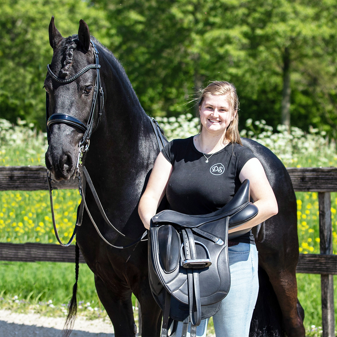 Mijn naam is Dana Scheepbouwer en al sinds ik mij kan herinneren heb ik een sterke voorkeur voor de grote koudbloedpaarden. Zelf heb ik inmiddels twee Shires, waar ik dressuur matig mee rij en waar ik door de jaren heen ernorm veel van geleerd heb, wat soms het nodige bloed, zweet en tranen gekost heeft (en soms nog steeds kost ;). Tijdens onze ontwikkeling zijn we tegen diverse uitdagingen aangelopen. Denk hierbij aan het niet kunnen aanspringen in galop, het scheef ontwikkeld zijn, beide onze voorkeurskant naar dezelfde kant hebben en het niet kunnen vinden van een passend zadel waarmee wij beide op de juiste manier aan onszelf konden werken.